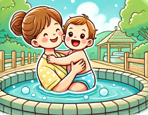 나 : 사우나에서 미끄러지지 않도록 뛰지말라고 하는 엄마와 아기, 아기는 신이나서 이러저리 뛰놀고 있다. 엄마랑 욕탕안에도 들어갔는데 아기는 처음이라 꺄르륵 거리면서 신나 하지만 발이 바닥과 닿지 않으니 재미있으면서도 무섭다. 엄마는 안심하라고 엄마가 있으니깐 괜찮다고 아기에게 계속 얘기하지만 아기는 이내 무서워져 밖으로 가자고 칭얼 거린다. 이상황을 아기 교육용으로 하는 상황을 영어로 만들어줘