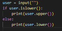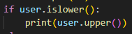 islower() 메서드는 user 변수에 저장된 문자열이 모두 소문자인 경우 True를 반환합니다. 만약 True라면 upper() 메서드를 사용하여 문자열의 모든 글자를 대문자로 변환하고, 이를 출력합니다.